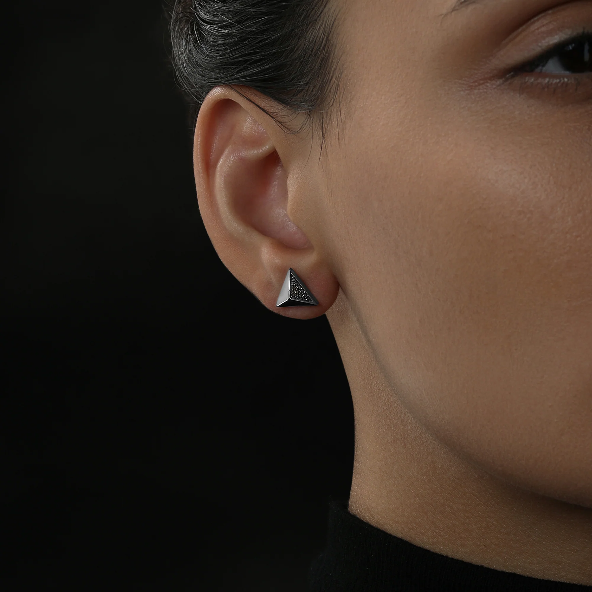 Dark Armor men's/women's pyramid stud earrings, made in high polish black rhodium and accented with black diamonds.