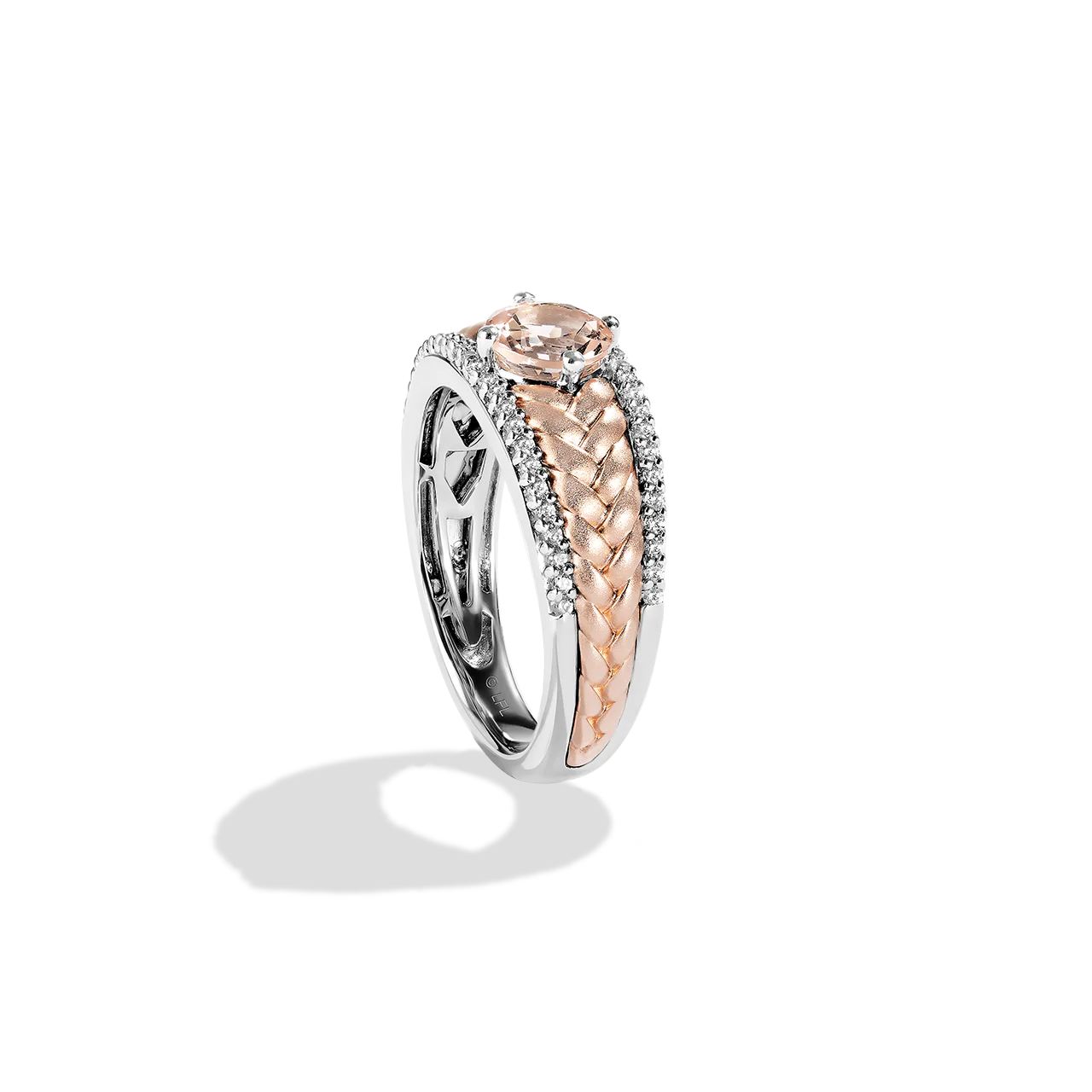 Galactic Royalty women's braided ring, made in silver and rose gold with diamonds and a morganite gemstone center.