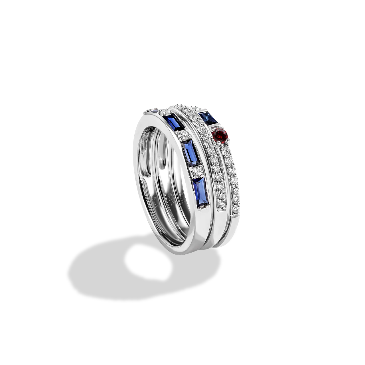 R2 Series multi layer fashion ring . Made in silver, white diamonds, garnet, and genuine blue sapphire.