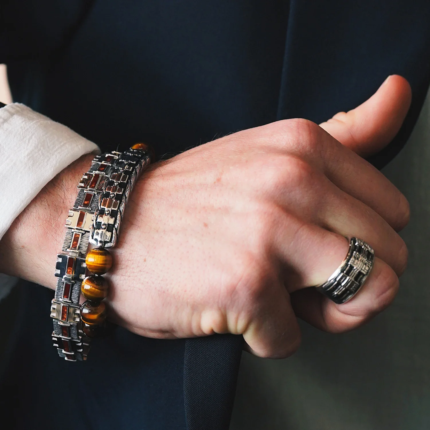 The Wookiee men's beaded bracelet. Made in silver with accents of black Rhodium, and tiger eye Shamballa beads.
